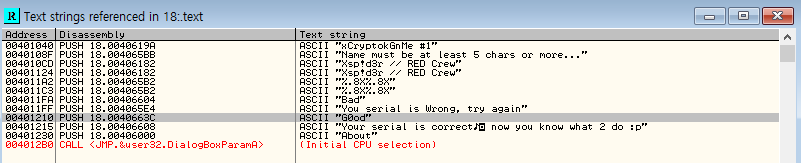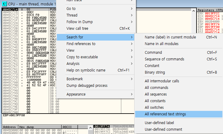 Ollydbg로 문제파일을 연 다음에 언제나 그렇듯 일단 text string을 통해 성공시의 텍스트를 찾아봅시다.